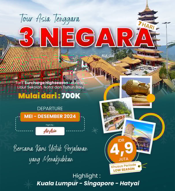 Nikmati perjalanan ke 3 Negara Asia Tenggara dengan mengunjungi Genting Highland, Merlion Park, Melaka, dan Hatyai. Temukan keindahan alam, budaya, dan landmark ikonik di setiap destinasi!