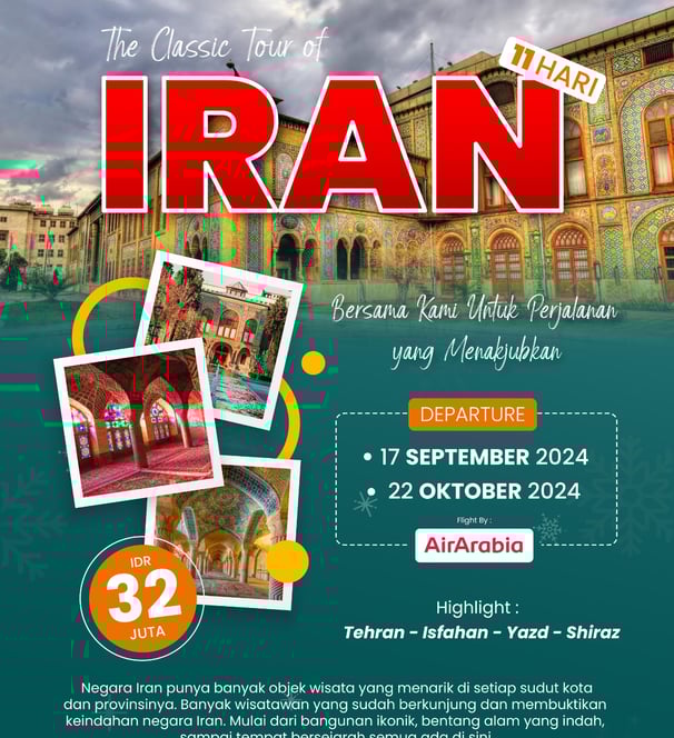 Jelajahi Iran dari Teheran modern ke kota-kota bersejarah seperti Isfahan, Yazd, dan Shiraz. Nikmati arsitektur Persia, taman megah, serta situs warisan UNESCO, dan rasakan keindahan warisan Islam dan Zoroastrianisme.