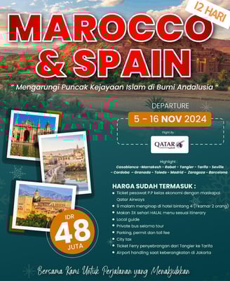 Jelajahi Maroko dan Spanyol, mulai dari Marrakech dan Casablanca hingga Tangier. Lanjutkan ke Spanyol, mengunjungi Seville, Cordoba, Granada, dan Barcelona. Nikmati arsitektur megah dan sejarah Islam yang memukau di setiap kota.